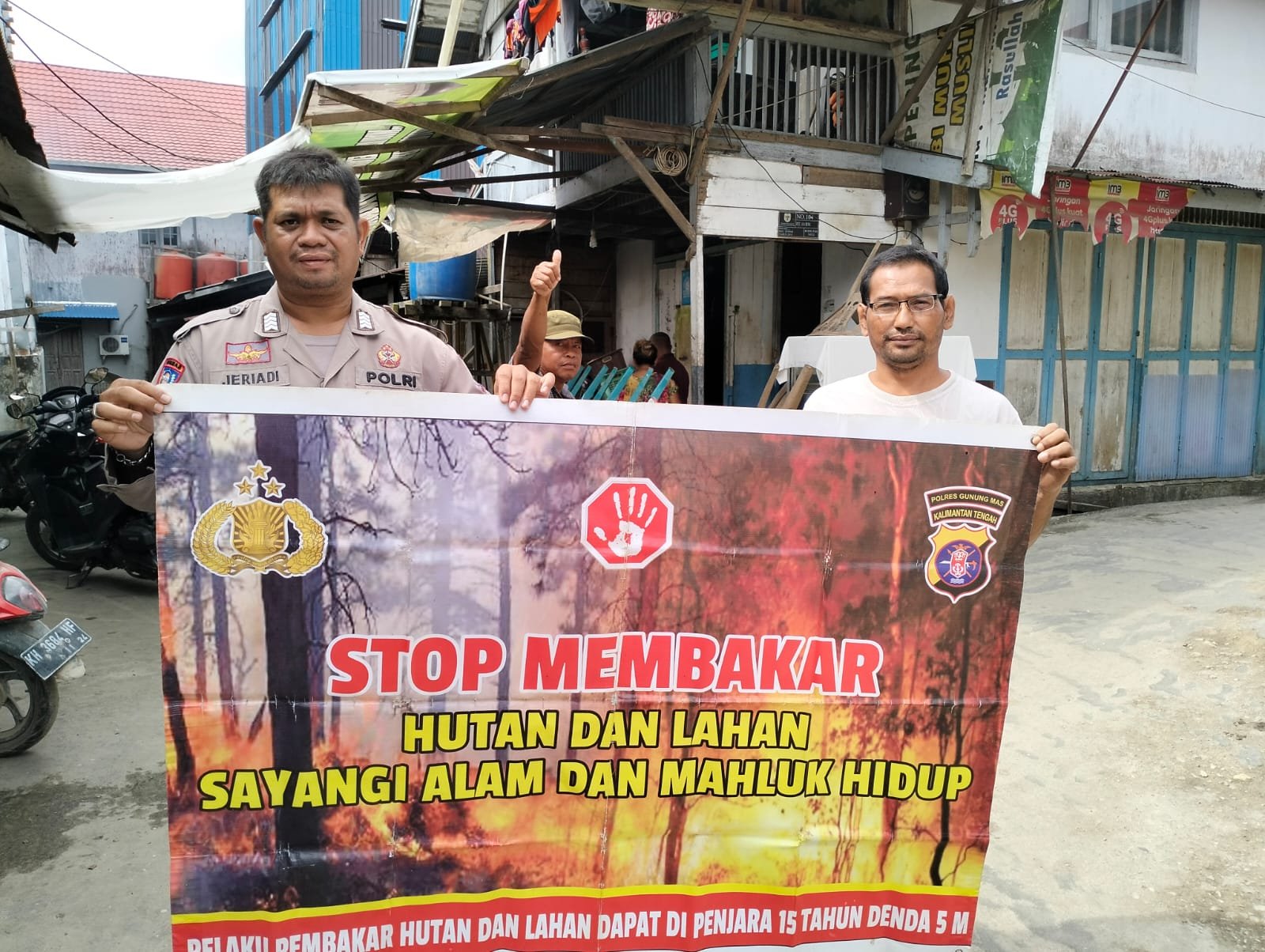 Polres Gunung Mas – Polsek Tewah jajaran Polres Gunung Mas (Gumas) Polda Kalteng dalam aksi mencegah Kebakaran Hutan dan lahan (Karhutla) memberi himbauan seperti menempel sticker/pamplet di rumah atau kios milik masyarakat tentang larangan dan bahaya membakar hutan dan lahan. Kamis, (14/9/2023) pukul 13.00 Wib.