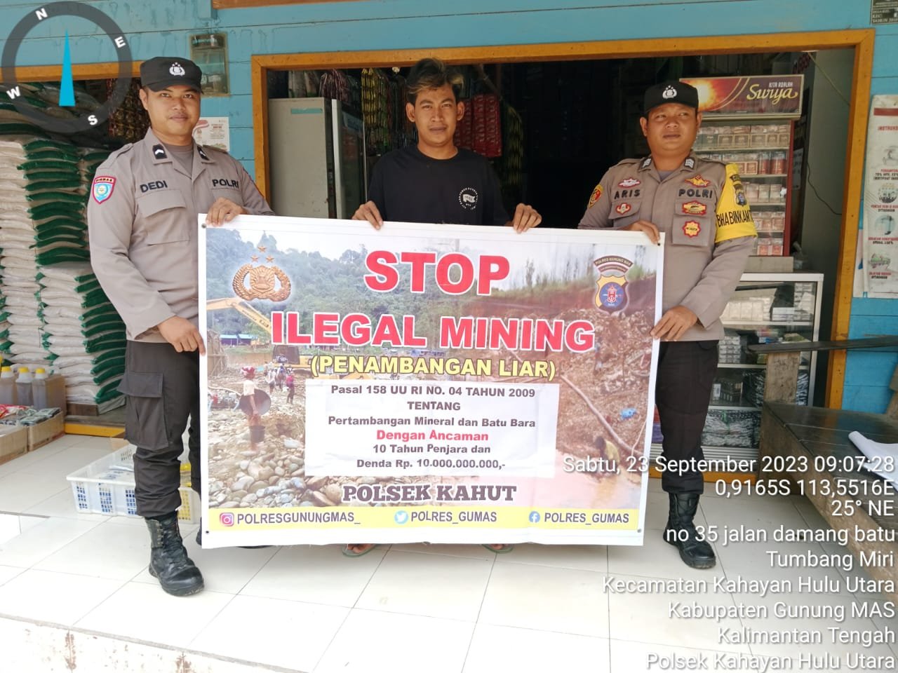 Polres Gunung Mas – Personel Polsek Kahayan Hulu Utara (Kahut) Polres Gunung Mas (Gumas) jajaran Polda Kalteng melaksanakan kegiatan rutin patroli serta memberi sosialisasi kepada masyarakat kecamatan Kahut agar jangan melakukan kegiatan penambangan tanpa ijin, alat peraga sosialisasi menggunakan spanduk. Sabtu, (23/9/2023) Siang.