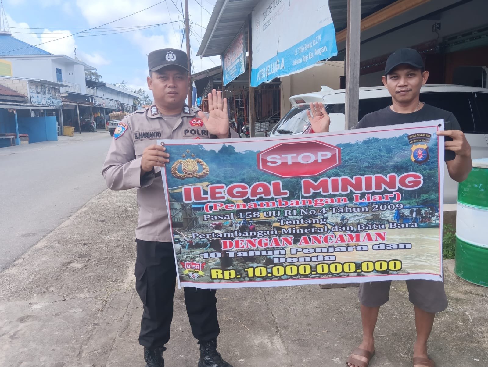 Bhabinkamtibmas Polsek Rungan membentangkan spanduk bertuliskan “ Stop Ilegal Mining serta sanksi pidana” Pasal 158 Undang Undang No.4 tahun 2009 Pidana Penjara 10 tahun dan denda 10 paling banyak 10 Milyar memberikan himbauan bersama-sama dalam menanggulangi Ilegal Mining.