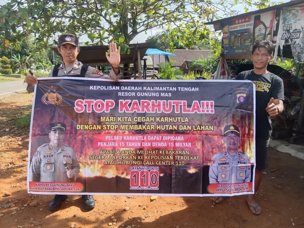 Polres Gunung Mas – Dalam upaya mengantisipasi kebakaran hutan dan lahan (Karhutla), Anggota Polsek Manuhing jajaran Polres Gunung Mas (Gumas) Polda Kalteng melaksanakan sosialisasi tentang larangan membakar  Hutan dan Lahan melalui tebar spanduk berikut sanksi hukumnya kepada warga masyarakat Kel. Tumbang Talaken di Kec. Manuhing Kab. Gumas, Kalteng.Sabtu (30/09/2023) pagi.