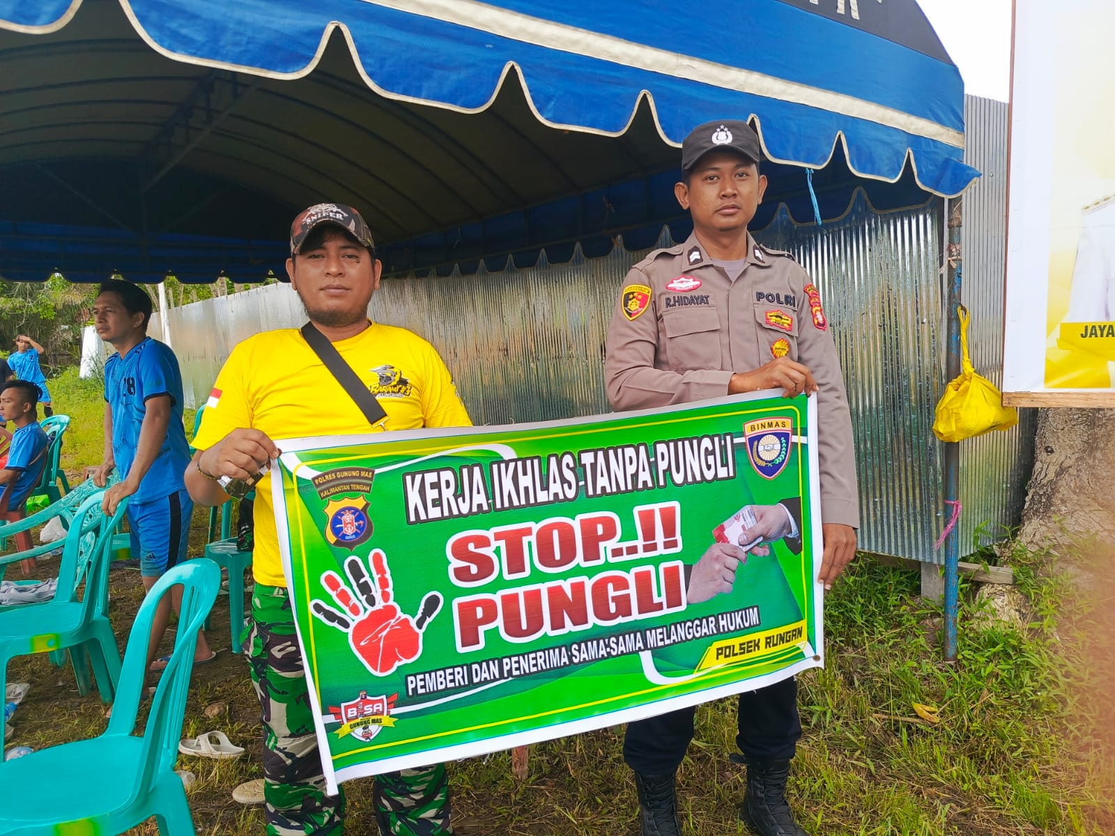 Dalam hal ini Polsek Rungan Polres Gumas membentangkan Spanduk Yang Bertuliskan “Stop Pungli… Pemberi dan Penerima sama – sama melanggar hukum, ada pungli laporkan segera. dan sekaligus Mensosialisasikan peraturan presiden nomor 87 tahun 2016 tentang Satuan tugas sapu bersih pungutan liar” kepada masyarakat.