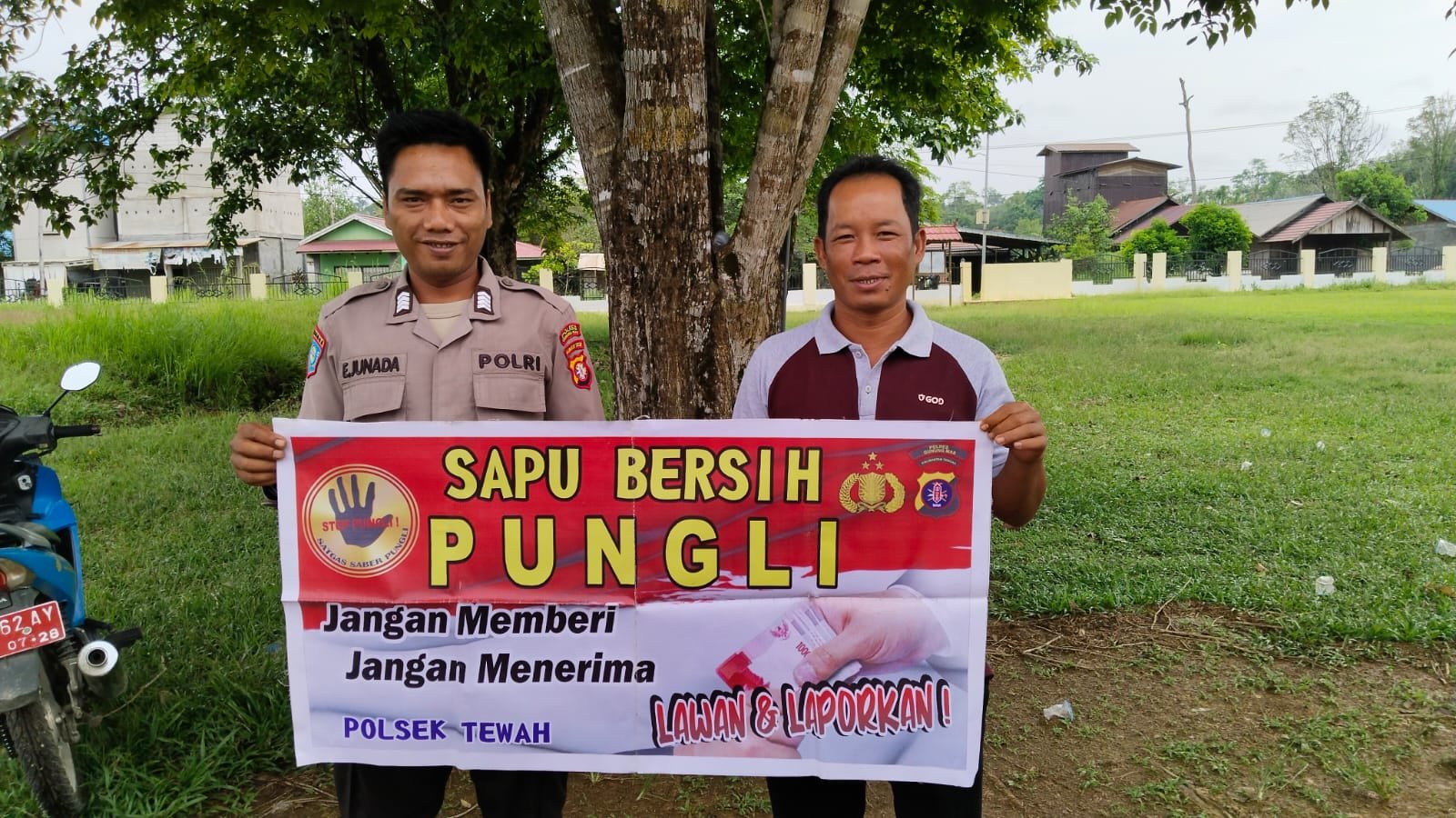Dalam hal ini Polsek Tewah membentangkan Spanduk Yang Bertuliskan “Stop Pungli… Pemberi dan Penerima sama – sama melanggar hukum, ada pungli laporkan segera. dan sekaligus Mensosialisasikan peraturan presiden nomor 87 tahun 2016 tentang Satuan tugas sapu bersih pungutan liar” kepada masyarakat.