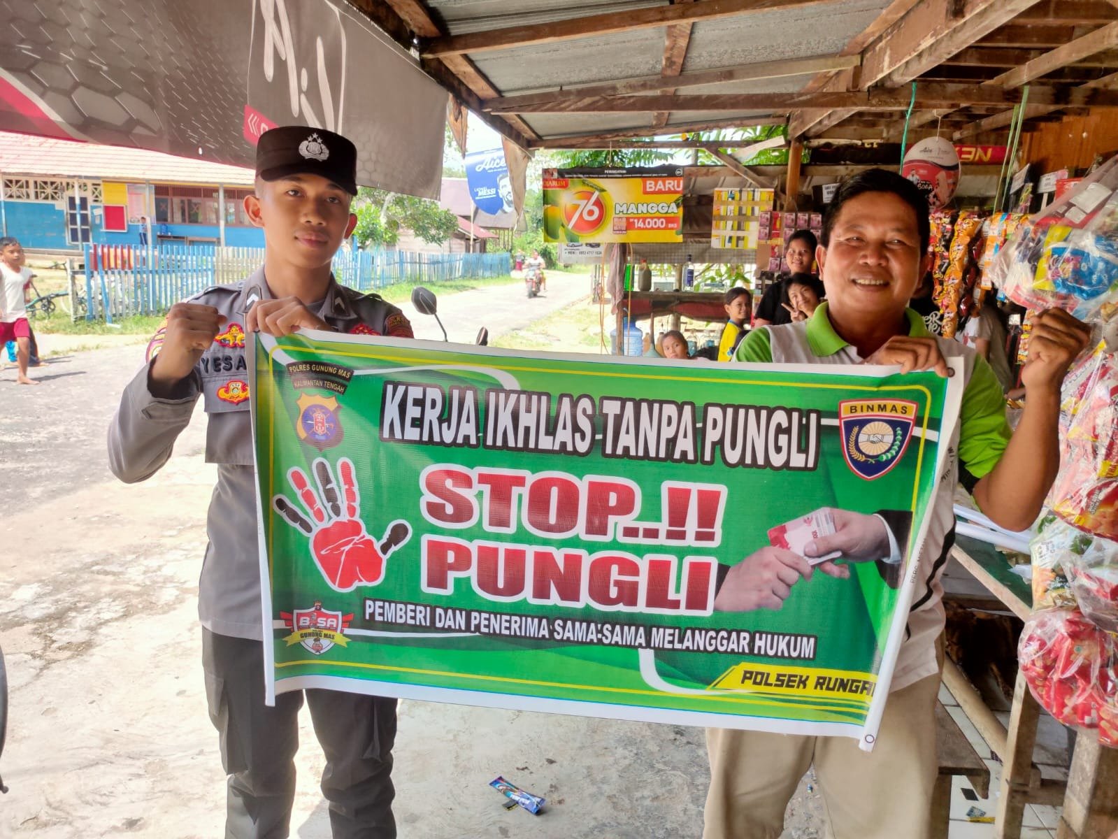 Dalam hal ini Polsek Rungan Polres Gumas membentangkan Spanduk Yang Bertuliskan “Stop Pungli… Pemberi dan Penerima sama – sama melanggar hukum, ada pungli laporkan segera. dan sekaligus Mensosialisasikan peraturan presiden nomor 87 tahun 2016 tentang Satuan tugas sapu bersih pungutan liar” kepada masyarakat.