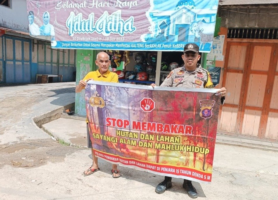 Polres Gunung Mas – Polsek Tewah jajaran Polres Gunung Mas (Gumas) Polda Kalteng dalam aksi mencegah Kebakaran Hutan dan lahan (Karhutla) memberi himbauan seperti menempel sticker/pamplet di rumah atau kios milik masyarakat tentang larangan dan bahaya membakar hutan dan lahan. Selasa, (21/11/2023) pukul 13.00 Wib.