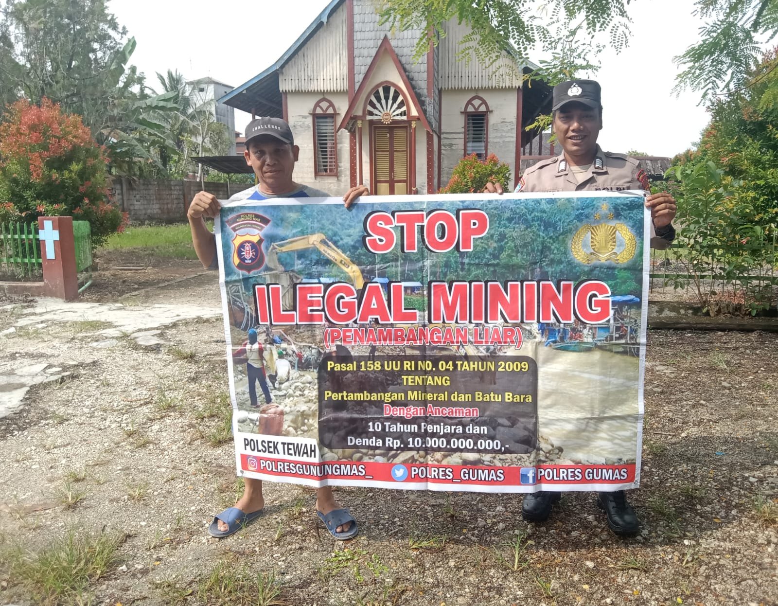 Kapolsek Tewah Ipda Teguh Triyono, S.H., mengatakan Personel Polsek Tewah membentangkan spanduk bertuliskan “ Stop Ilegal Mining serta sanksi pidana” Pasal 158 Undang Undang No.4 tahun 2009 Pidana Penjara 10 tahun dan denda 10 paling banyak 10 Milyar memberikan himbauan bersama-sama dalam menanggulangi Ilegal Mining.