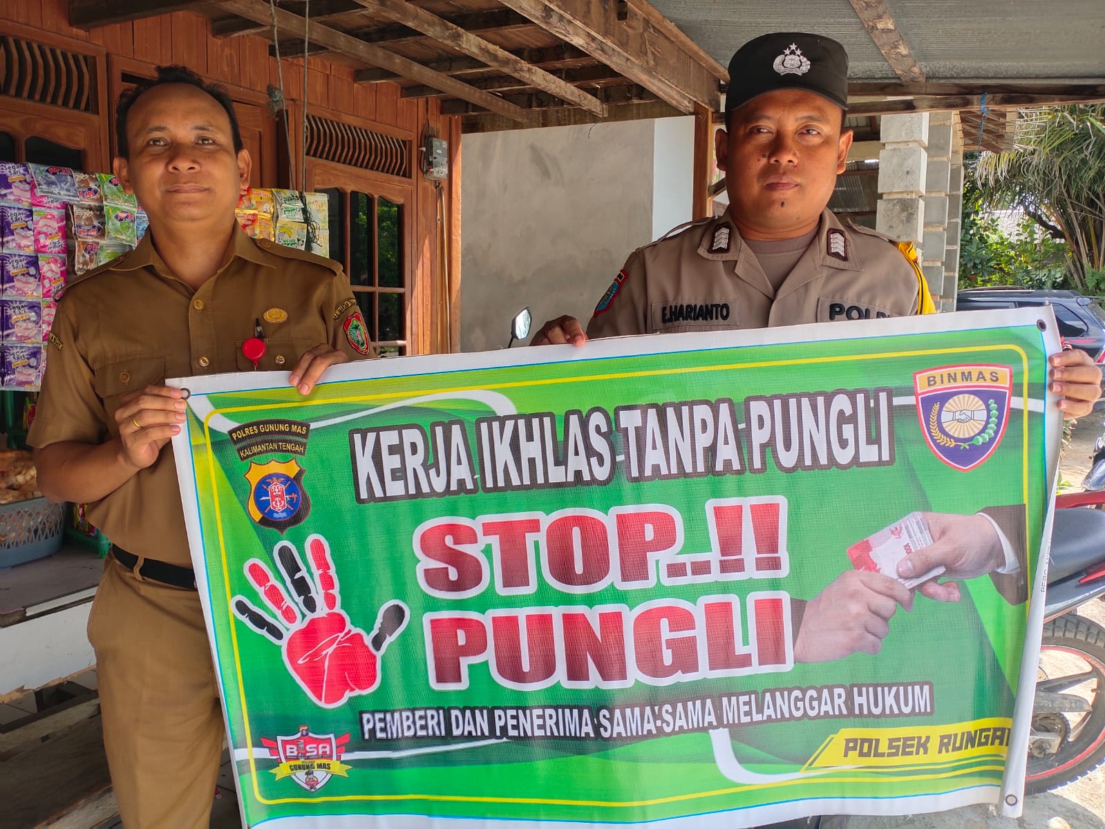 Dalam hal ini Polsek Rungan Polres Gumas membentangkan Spanduk Yang Bertuliskan “Stop Pungli… Pemberi dan Penerima sama – sama melanggar hukum, ada pungli laporkan segera. dan sekaligus Mensosialisasikan peraturan presiden nomor 87 tahun 2016 tentang Satuan tugas sapu bersih pungutan liar” kepada masyarakat.