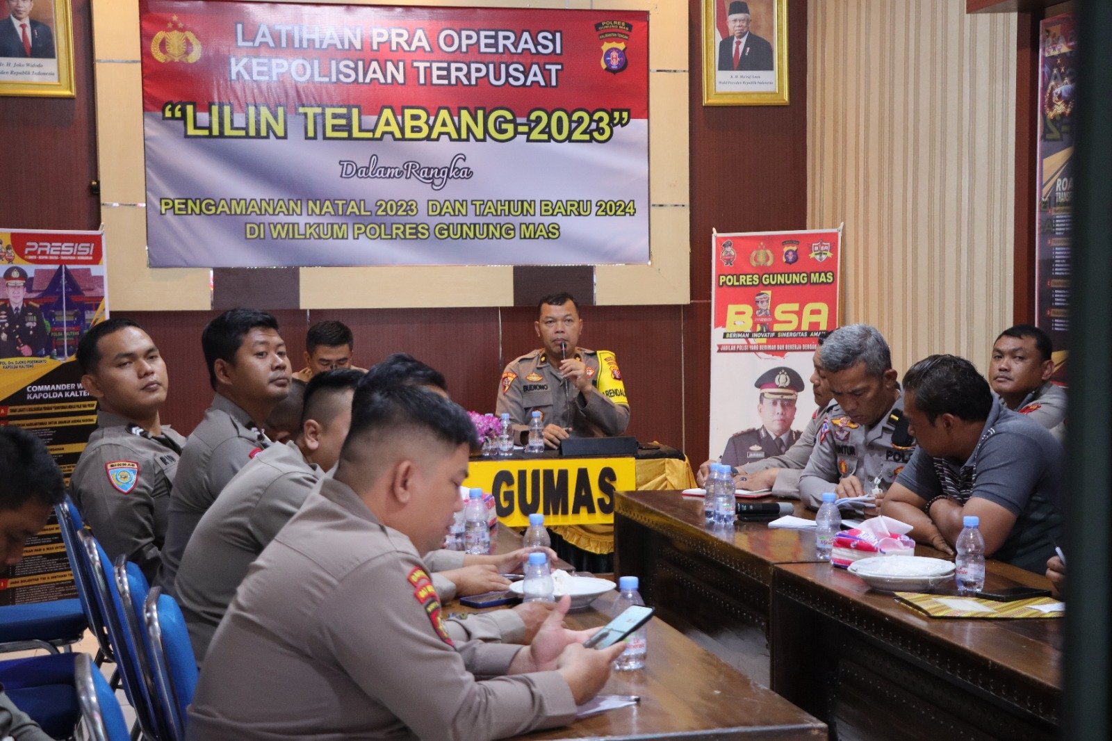 Polres Gunung Mas – Polres Gunung Mas telah menggelar latihan pra operasi (latpraops) dengan sandi “Lilin Telabang 2023” guna memaksimalkan pengamanan selama libur Natal dan Tahun Baru bertempat di Aula Rupatama Polres Gunung Mas, Kuala Kurun, Gunung Mas (gumas), Kalimantan Tengah (kalteng). Rabu (20/12/23) sekitar pukul 09.00 WIB