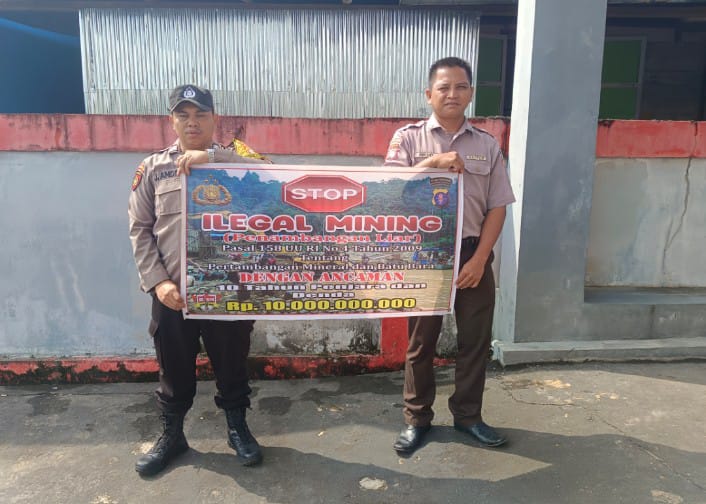 Bhabinkamtibmas Polsek Rungan membentangkan spanduk bertuliskan “ Stop Ilegal Mining serta sanksi pidana” Pasal 158 Undang Undang No.4 tahun 2009 Pidana Penjara 10 tahun dan denda 10 paling banyak 10 Milyar memberikan himbauan bersama-sama dalam menanggulangi Ilegal Mining.
