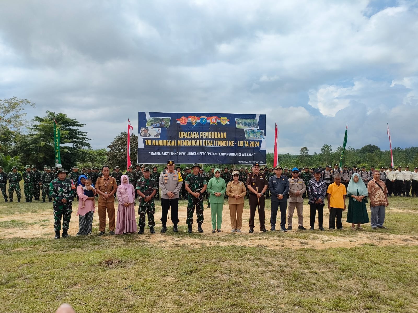 Polres Gunung Mas – Kapolres Gunung Mas AKBP Theodorus Priyo Santosa, S.I.K. menghadiri upacara pembukaan TNI Manunggal Membangun Desa (TMMD) ke-119 di Kecamatan Manuhing, Kabupaten Gunung Mas (gumas), Kalimantan Tengah (kalteng), Selasa (20/2/24) pagi.