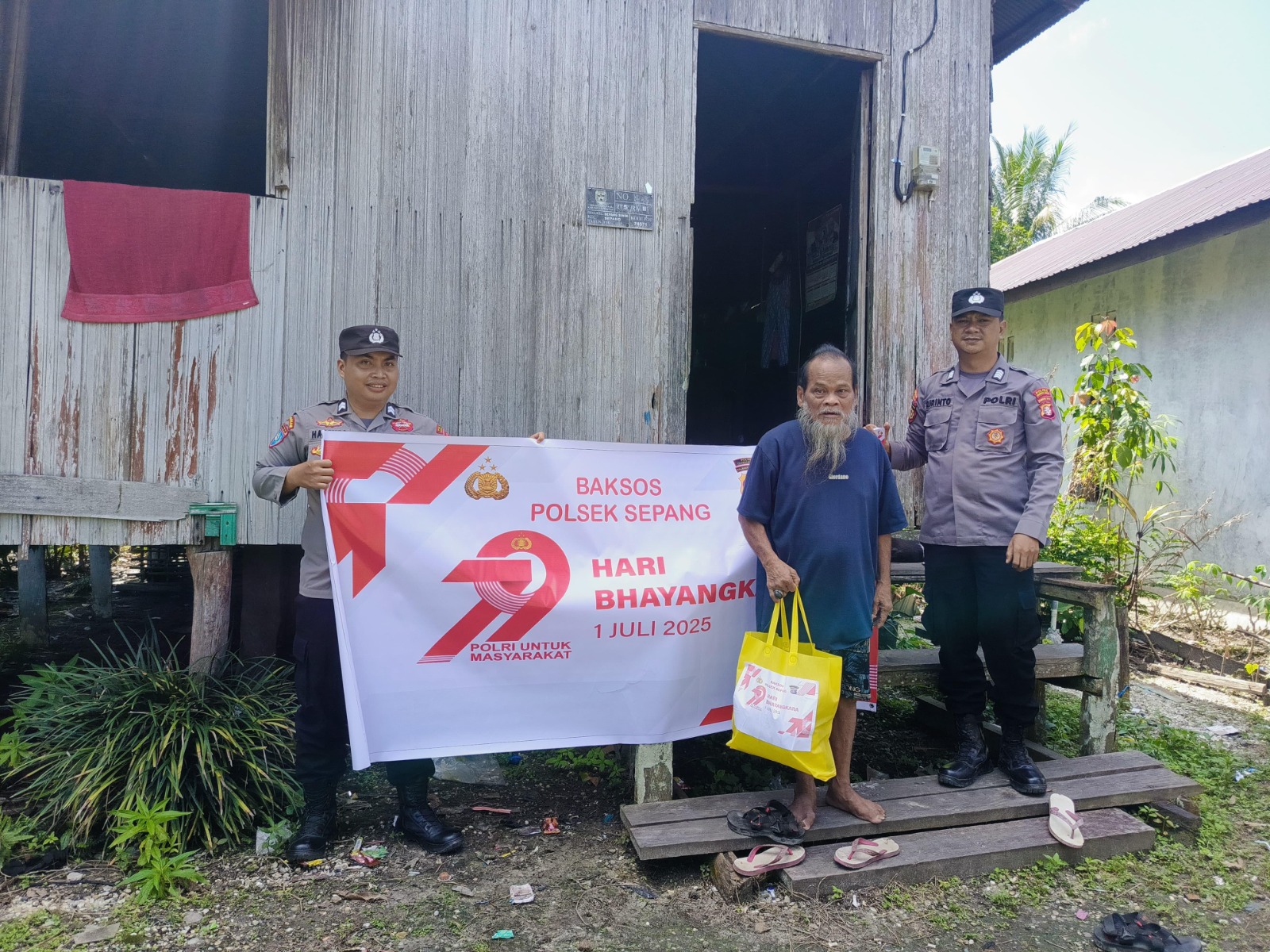 Sepang Simin, Gunung Mas – Semangat kepedulian dalam rangka menyambut Hari Bhayangkara ke-79 tak pernah surut di Kecamatan Sepang. Personel Polsek Sepang kembali melanjutkan aksi sosialnya, menyambangi langsung rumah-rumah warga untuk menyalurkan bantuan paket sembako, Minggu (29/6/2025).