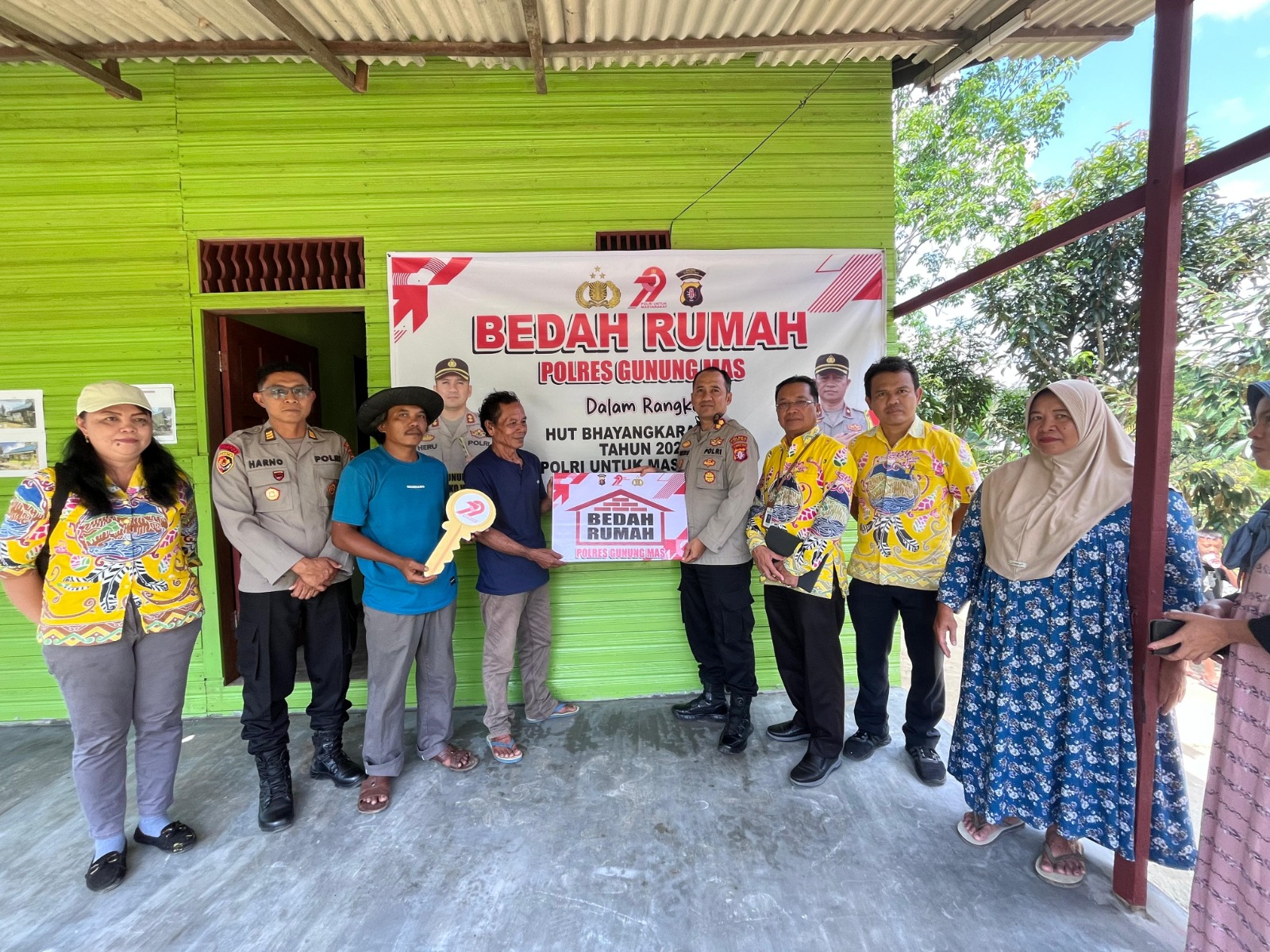 Kuala Kurun, Gunung Mas – Suasana penuh haru dan syukur menyelimuti kediaman Bapak Wahyu Arrohman di Jalan Seth Adji, Kuala Kurun. Impian keluarga ini untuk memiliki rumah yang layak huni akhirnya terwujud melalui program bedah rumah yang diinisiasi oleh Polres Gunung Mas sebagai bagian dari rangkaian kegiatan kemanusiaan memperingati Hari Bhayangkara ke-79, Kamis (3/7/2025) pukul 11.00 WIB.