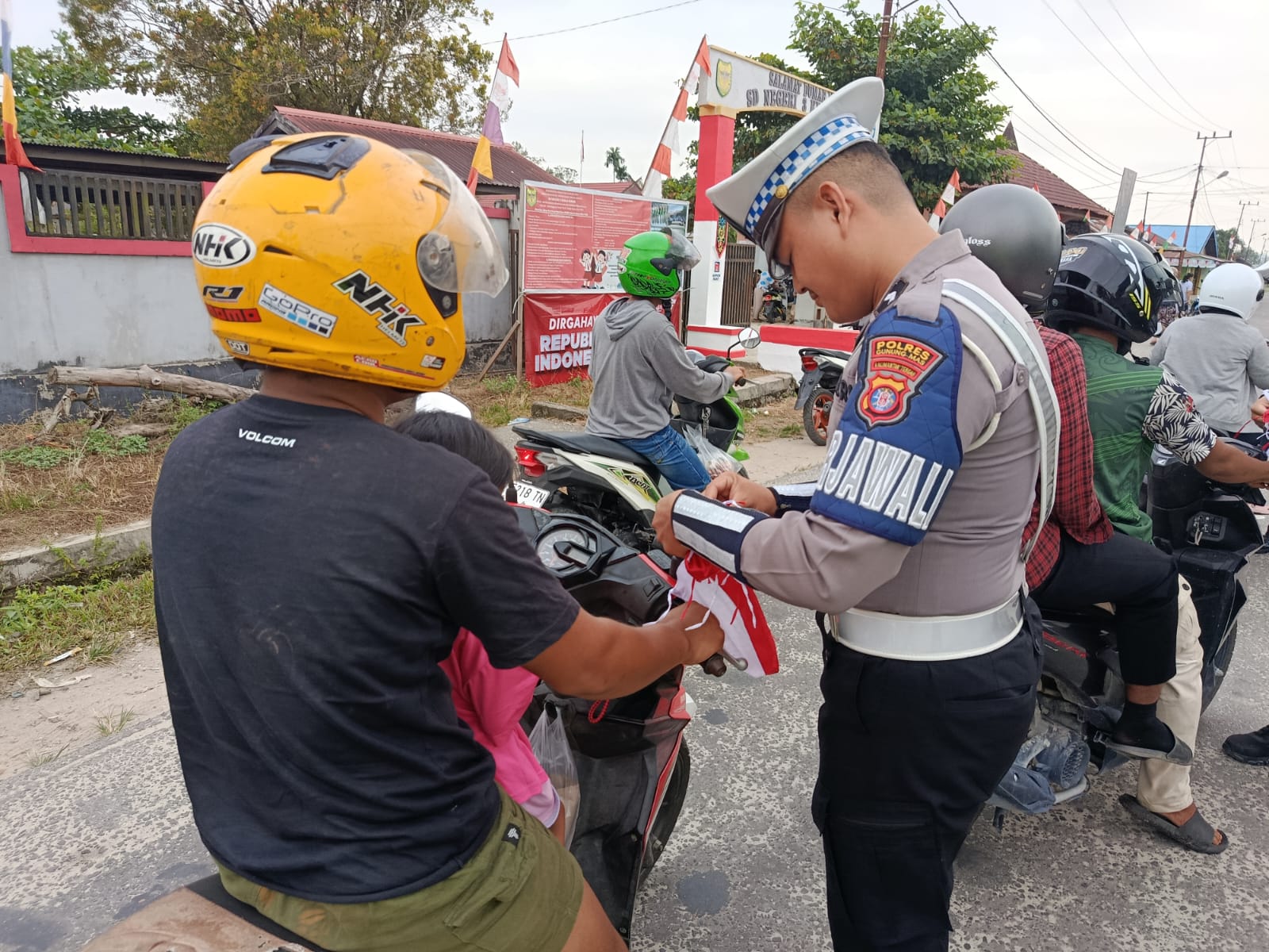 Kegiatan unik ini dilaksanakan tepat di depan Pos Lantas Taman Kota Kuala Kurun pada pukul 12.00 WIB. Para pengendara, baik roda dua maupun roda empat, yang melintas di area tersebut dihentikan sejenak oleh anggota piket Satlantas bukan untuk diperiksa kelengkapan surat-suratnya, melainkan untuk diberikan bendera Merah Putih.