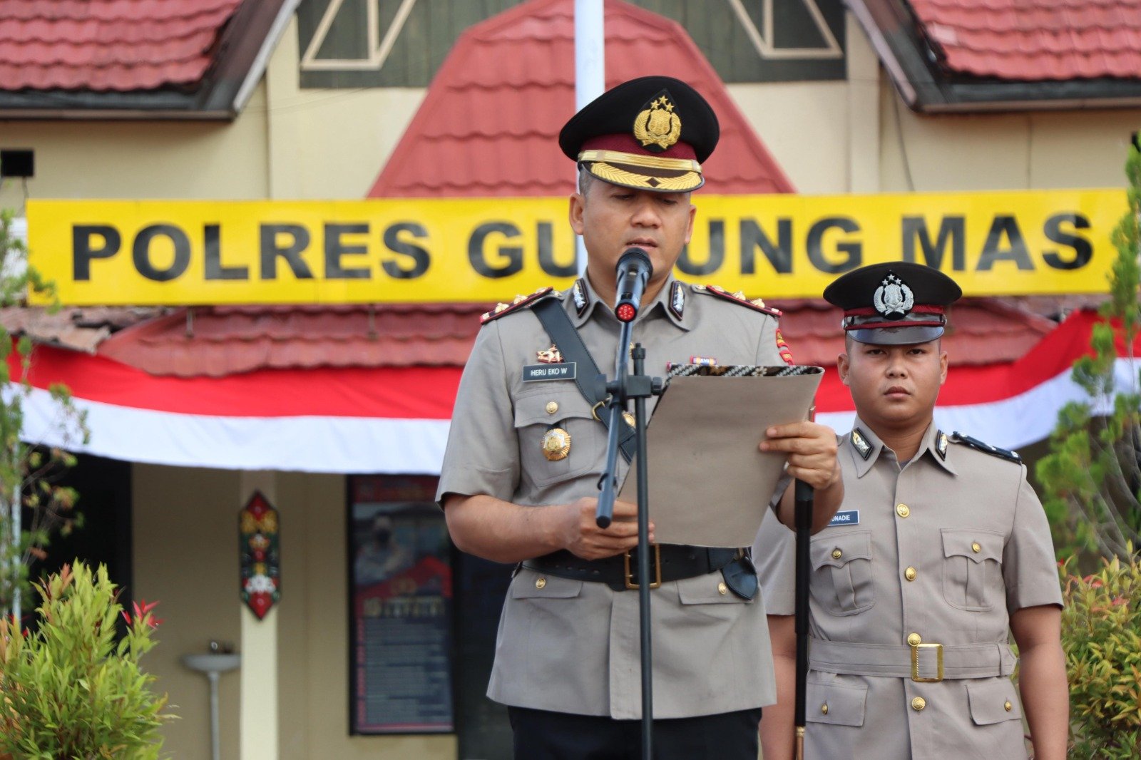 Bertindak selaku Inspektur Upacara, Kapolres Gunung Mas, AKBP Heru Eko Wibowo, S.I.K., M.H., memimpin langsung jalannya upacara yang diikuti oleh Wakapolres Kompol Indras Purwoko, S.H., seluruh pejabat utama, personel Bintara, serta Aparatur Sipil Negara (ASN) di lingkungan Polres Gunung Mas.