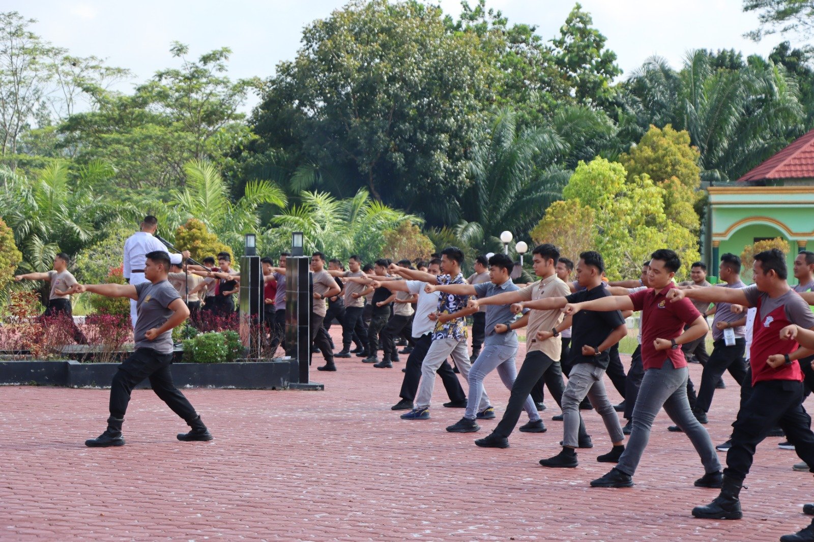 Bertempat di Lapangan Apel Tantya Sudhirajati, para personel dengan penuh semangat mengikuti setiap instruksi gerakan beladiri yang dicontohkan. Wakapolres Kompol Indras Purwoko tidak hanya memantau, tetapi juga turun langsung untuk memberikan arahan dan memperbaiki teknik para personel, memastikan setiap gerakan dilakukan dengan benar dan efektif.